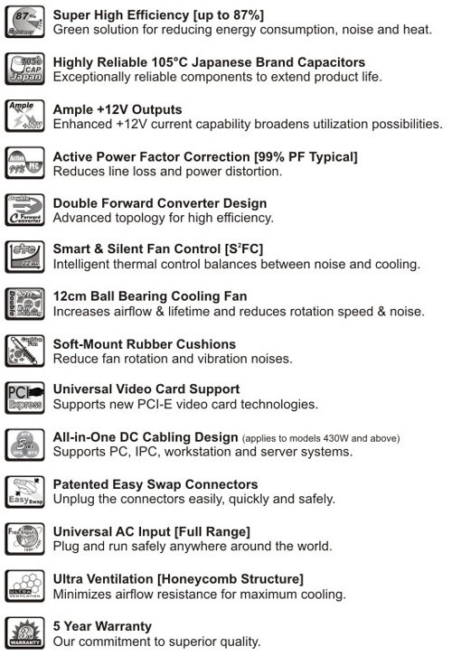 In addition to the efficiency upgrade, the S12II Bronze Series maintains the strong foundations of the S12II series. Important features such as the stable and proven Double Forward Converter circuit design, the industry leading Smart and Silent Fan Control (S2FC) and the use of high reliability Japanese brand capacitors are all carried forward to the “Bronze”.
