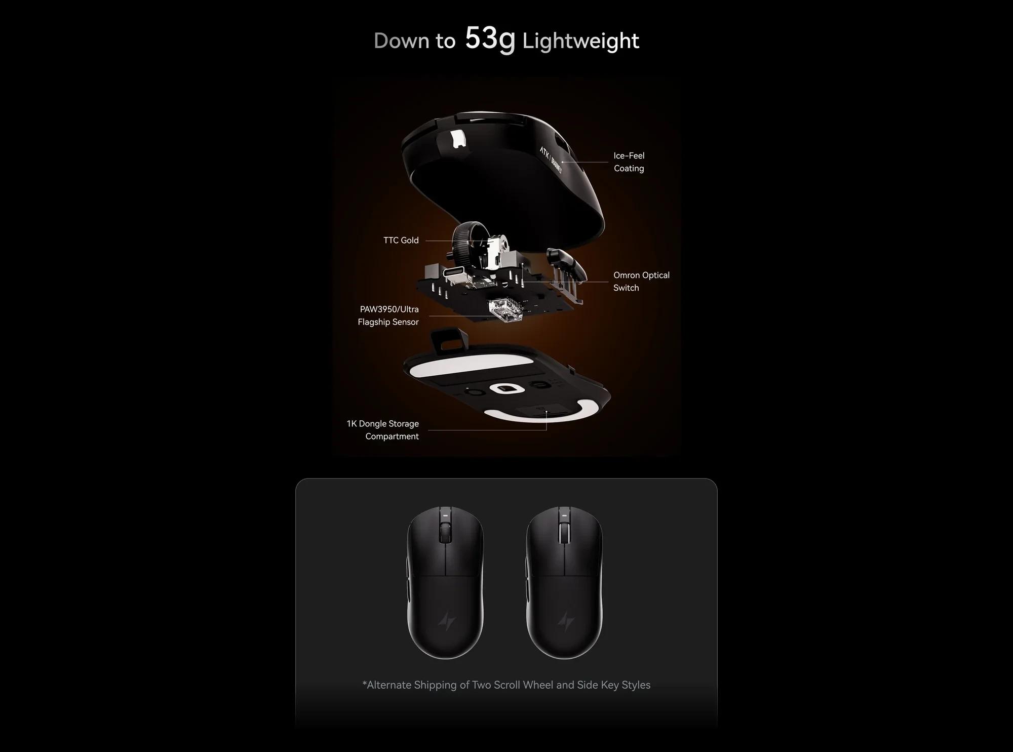 | OTHERS | Ice-feel / anti-sweat coating for grip and comfort Battery Capacity: ~800 mAh built-in rechargeable battery Battery Life: Up to ~240 hours on NearLink wireless mode Quick Charging: Fast Type-C charge (30 min charge yields several hours use) Max Tracking: high IPS and acceleration typical for PAW3395 class sensors |