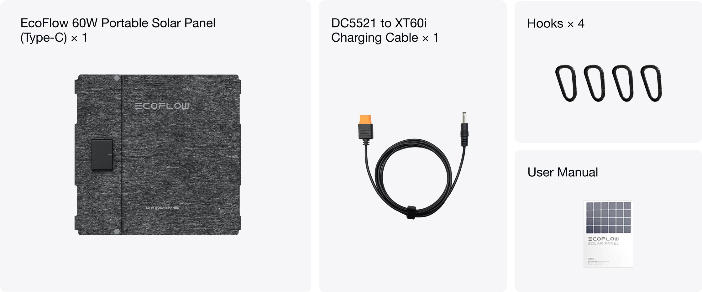 OTHERS | INCLUDED: EcoFlow 60W Portable Solar Panel (Type-C) ; 1DC5521 to XT60i Charging Cable ; Hooks x 4 ; User Manual |