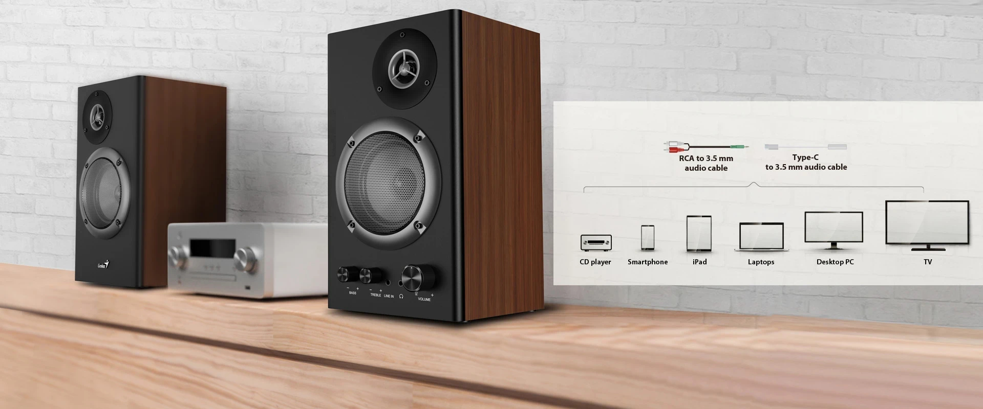 | EXTRAS | Adjustable Volume, Bass and Treble controls 2" tweeter and 4" woofer drivers What`s included: SP-HF1200B RCA to 3.5mm audio cable x 1 Type-C to 3.5mm audio x 1 AC power cord x 1 Quick guide printing in box |