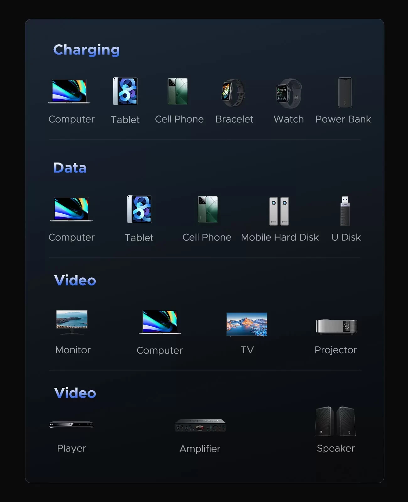 | OTHERS | Transmission Speed: 80Gbps Output Power: 240W(Max) Video Output: 8K Material: Copper Alloy, PVC |