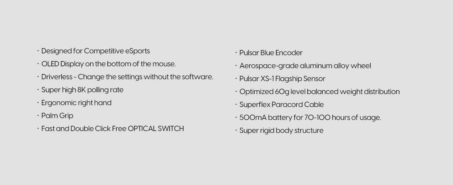 OTHERS | OLED Display on the bottom of the mouse Driverless - Change the settings without the software Super high 8K polling rate Pulsar Blue Encoder Aerospace-grade aluminum alloy wheel Superflex Paracord Cable 500mA battery for 70-100 hours of usage |