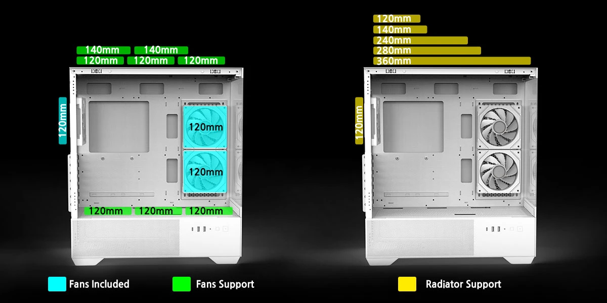 | INCLUDED FANS | Side: 2 x 120 mm (ARGB) Rear: 1 x 120 mm (ARGB) |