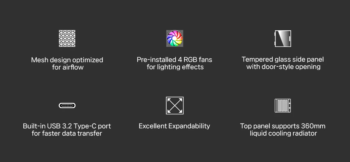 | OTHERS | USB-C x 1 Pre-installed 4 RGB fans Hinged glass side panel Magnetic dust filter Supports up to 8 fans |