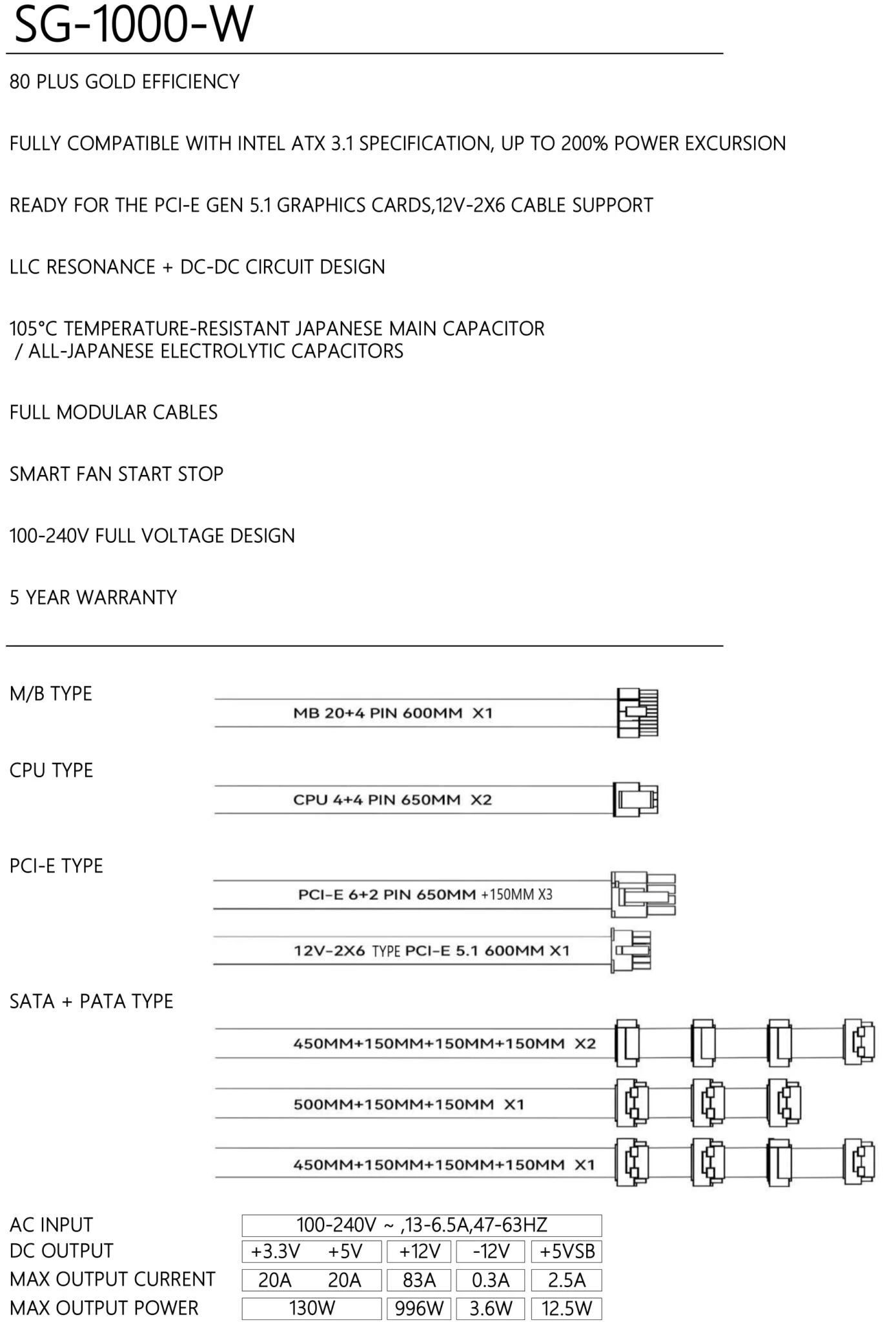 | ДРУГИ | 200% Power Excursion PCI-E Gen 5.1 Native 12+4 PIN 12VHPWR Cable Support DC-DC LLC Half-Bridge Structure Durable 105C Rated Quality Japanese Capacitors 120 mm Intelligent Start-Stop Fan Multiple Line Protection Circuit Design |