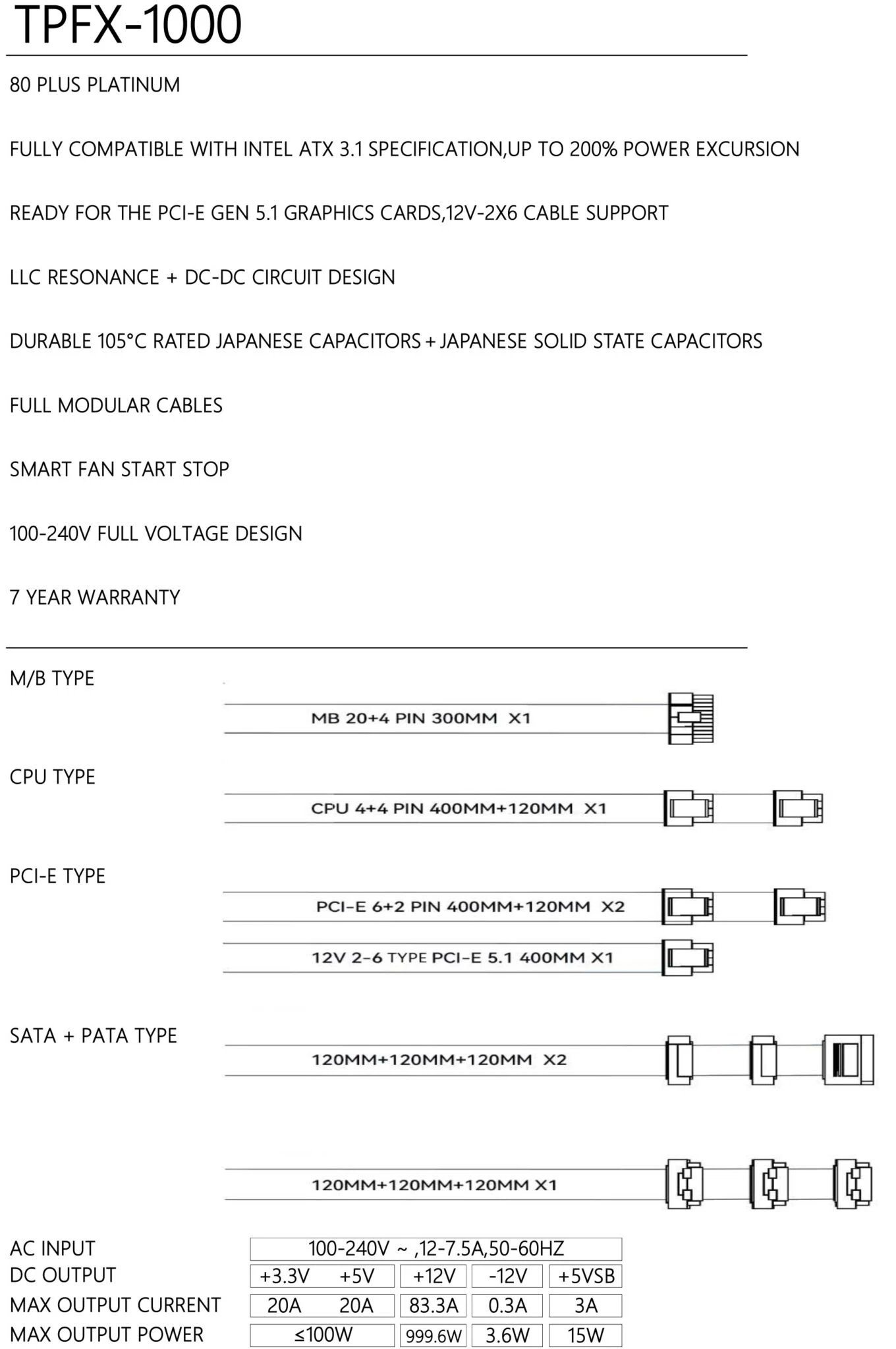 | ДРУГИ | Fully Compatible with intel ATX 3.1 SPECS, up to 200% power excursion LLC Resonance + DC-DC Circuit Design Smart Fan Start Stop Durable 105 C rated japanese capcitors + japanese solid state capacitors |