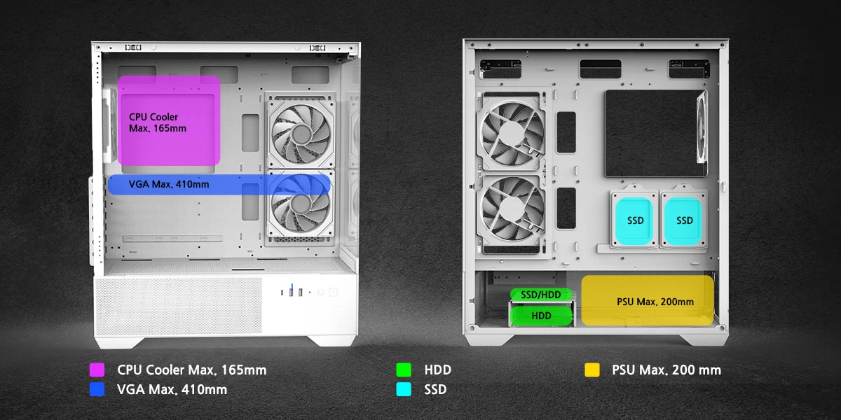 | ДОПЪЛНИТЕЛНИ | Modern & Sleek Design Panoramic View With Seamless Tempered Glass Panels Tool-Free Glass Panels Optimal Airflow Pre-installed ARGB Infinity Mirror Fans Mesh Bottom Panels 6-port PWM/ARGB hub |